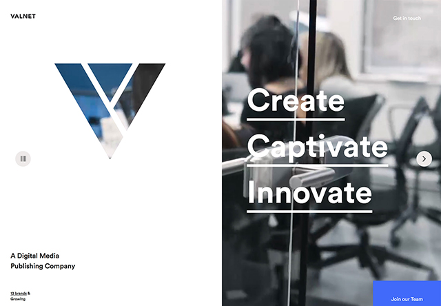 這個(gè)月的最后一個(gè)趨勢對(duì)所有業(yè)余印刷工來說都很有趣。設(shè)計(jì)人員選擇填充類型(或創(chuàng)建層,以復(fù)制圖像填充的外觀),并使用厚塊樣式的字母。雖然這個(gè)觀點(diǎn)并沒有什么特別的新意,但對(duì)這個(gè)概念的解釋卻是。下面的三個(gè)例子都使用了一些文本填充的移動(dòng)圖像。在網(wǎng)頁左側(cè)的白色框架中,Valnet將其簽名“V”剪掉。在后臺(tái),一個(gè)視頻循環(huán)播放。信中的圖像是背景中的視頻的一部分。這是一個(gè)很好的效果,讓設(shè)計(jì)師可以使用一個(gè)更垂直的框架,而不需要一個(gè)奇怪的視頻框架。最偉大的故事也使用了同樣的概念,但留給用戶更多的想象力。在背景中有視頻b-roll,但它實(shí)際上只在星形設(shè)計(jì)中創(chuàng)造了一種運(yùn)動(dòng)和色彩的感覺。它所做的是吸引用戶點(diǎn)擊并真正進(jìn)入網(wǎng)站的設(shè)計(jì)和內(nèi)容。