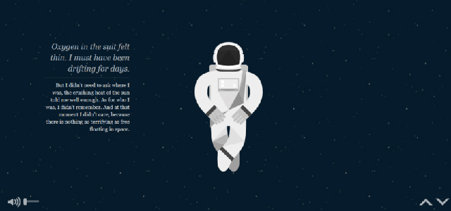 這是一個(gè)成功的講故事和視差的例子。另外,注意著陸時(shí)的導(dǎo)航。有箭頭和滾動(dòng)條可以幫助游客上下移動(dòng),更好地把握故事。有了這樣的方法,設(shè)計(jì)師就會(huì)邀請(qǐng)網(wǎng)站訪問者積極參與。