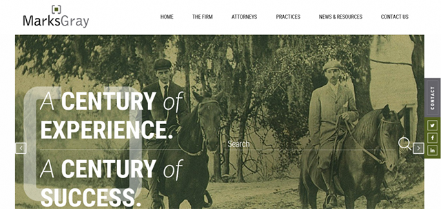 Marks Gray的開頭看起來很簡潔,但這不是問題。相反,網(wǎng)站看起來時尚而專業(yè),這對于律師事務(wù)所來說尤為重要。導(dǎo)航很方便。商標和公司的名字一眼就能看出來,所有公司的做法都列了出來。另一件好事是這家公司在幾個社交網(wǎng)絡(luò)上都有賬戶。然而,如果你遵循同樣的策略,不要放棄你的賬戶——定期發(fā)布一些東西。