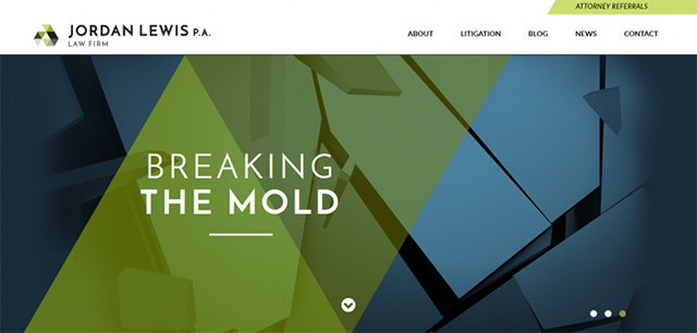 這是我們最后一個關(guān)于網(wǎng)站設(shè)計律師事務(wù)所的例子——Jordan Lewis P.A.。他們有一個單獨的頁面,但你也檢查他們在開始的一個。此外,您還可以找到關(guān)于案例結(jié)果的信息。提供的聯(lián)系表單盡可能簡單——它只有4個字段。它的導(dǎo)航功能非常方便,還提供了一些社交網(wǎng)絡(luò)賬戶。